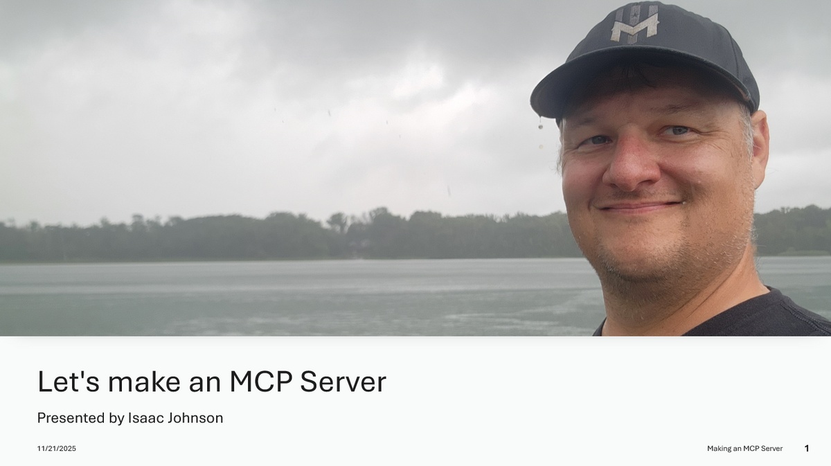 I'll be speaking after lunch: "Let's build an MCP Server". As I likely have just 30m of time, it will be a fast moving walk-through on how to make an Model Context Protocol (MCP) server one can use with a variety of GenAI tools (e.g. Gemini CLI, Antigravity, Codex, CoPilot, etc). I go from Ideation through to setup, configuration, CICD and low-cost serverless Cloud Run serving (in addition to local docker). Since I typically use Python (FastMCP), this one uses NodeJS with the MCP SDK. Code and examples will be provided.